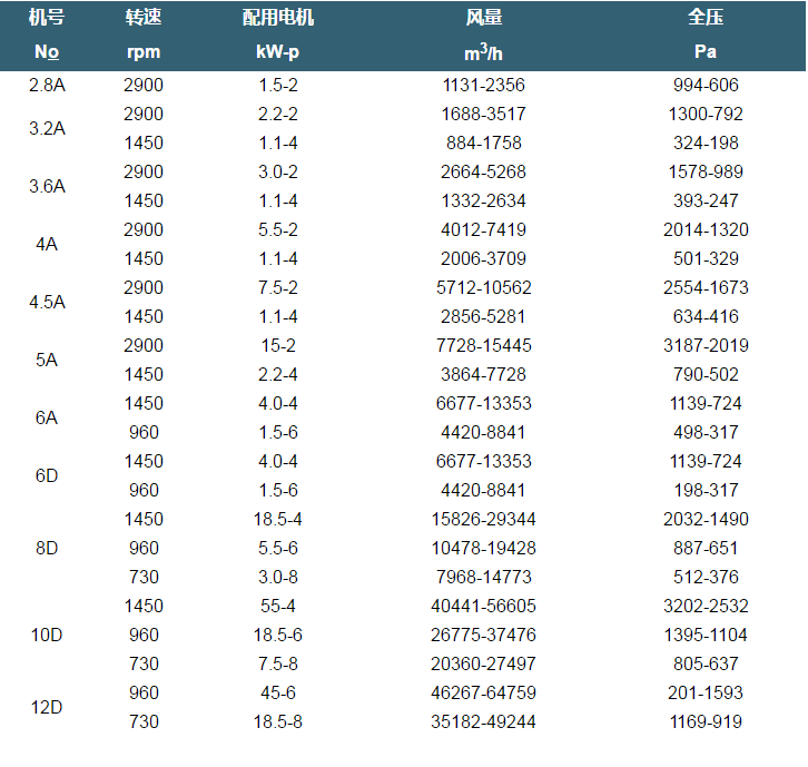 BF4-72型風機的性能與選用件及地基尺寸與4-72型-致,可按其樣本選擇。該風機機構(gòu)基本與4-72型相同,m.2.8-6采用B35型帶法蘭盤與地腳的電機,0.6-12C、D電動機選用表中與Y系列相對應(yīng)的YTB系列,安裝形式為B3。